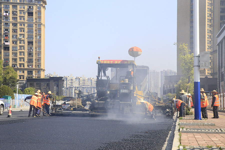 2019年8月,宜春經(jīng)開區(qū)S311路面攤鋪現(xiàn)場,工友們輔助路面兩側(cè)的分料、補窩等作業(yè)